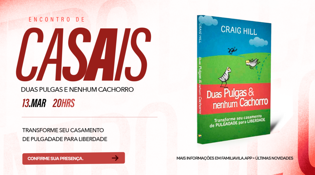 No dia 13/03, às 20h, acontece mais uma edição do Encontro de Casais da igreja, inspirado no livro Duas Pulgas e Nenhum Cachorro. Um momento especial para refletir sobre o relacionamento, fortalecer a parceria e dar passos práticos rumo a um casamento mais saudável e livre.